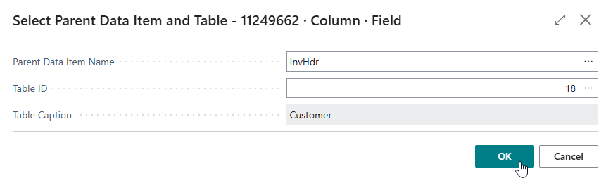 InvHdr(Sales Invoice Header) dataitem. As the table, we will be selecting the Customer table.Click on OK.