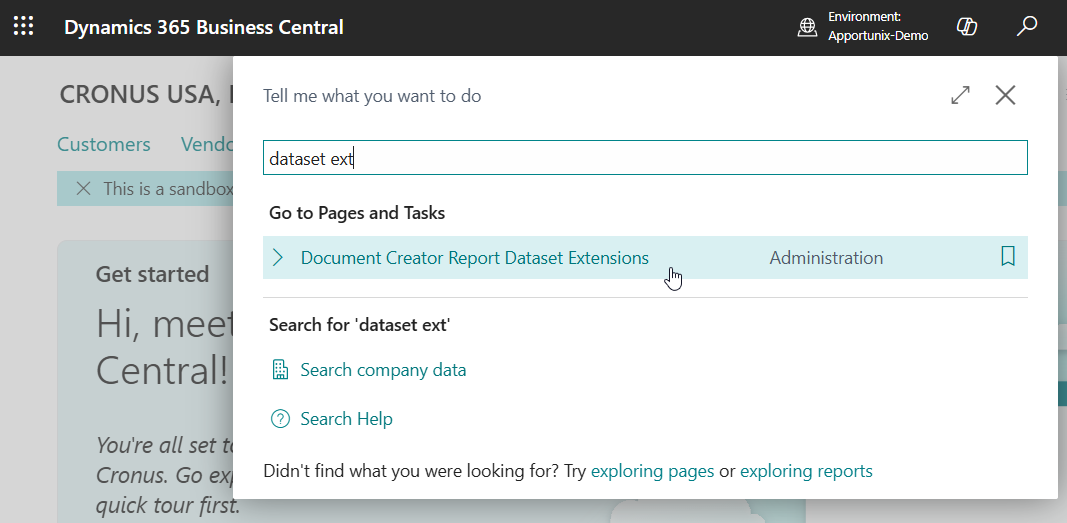 Use the Tell Me search feature (Alt+Q, or click on the ‑icon in the top right corner) to search for and open up the Document Creator Report Dataset Extensions page.