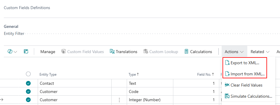 It's possible to export and import Custom Fields, Tiles and Headlines between companies or environments. Therefore 2 actions are added to the ribbon of the Custom Fields Definitions and Custom Fields Setup page.