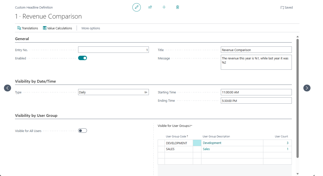 The Title and Message settings on the Custom Headline Definition card page define the default text that is displayed on the headline.